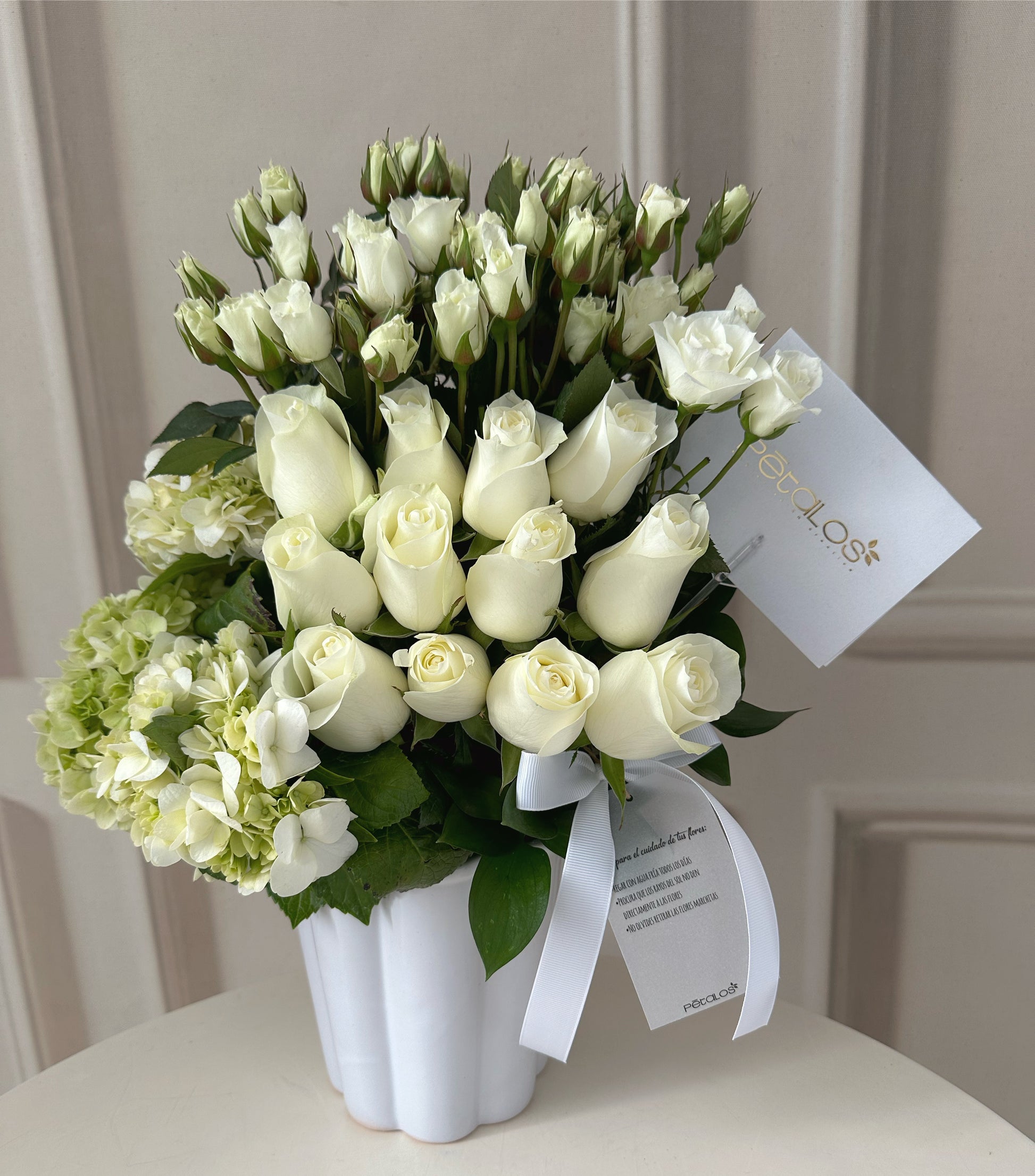 Arreglo floral en base de ceramica blanca con 12 rosas, hortensia, y mini rosa blancas con follajes verdes.